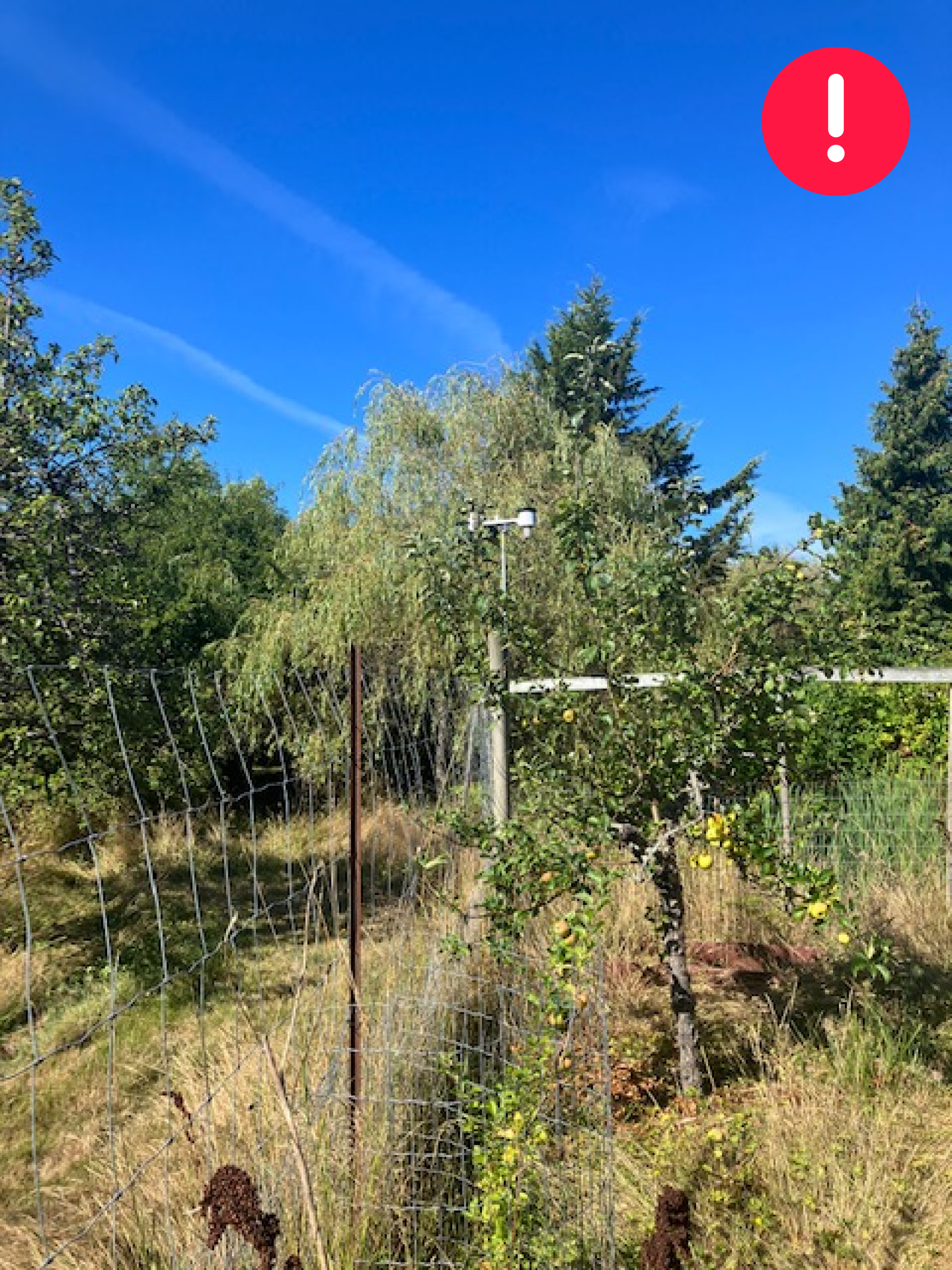 The station is deployed on an appropriate mast, but it is not at the highest possible point of the area (there is a higher building to the north and tall trees to the south). There is also a chimney below it.